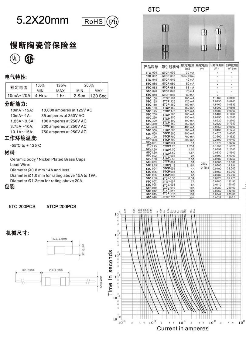 5.2x20mm陶瓷慢斷保險(xiǎn)絲
